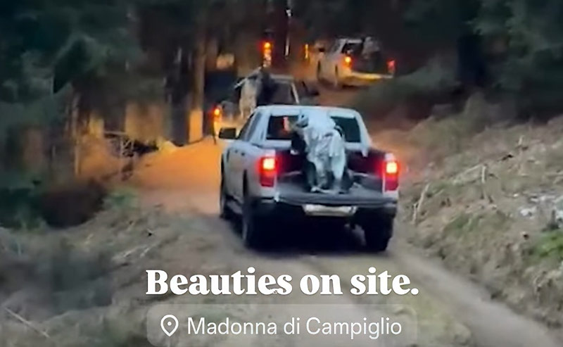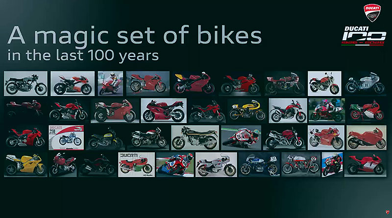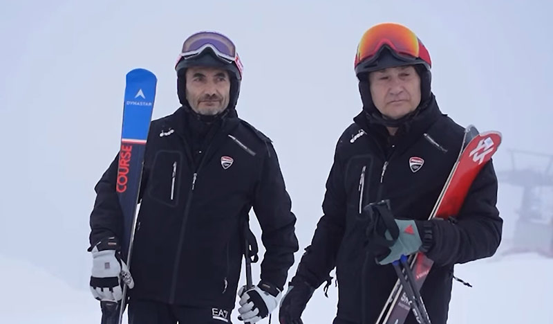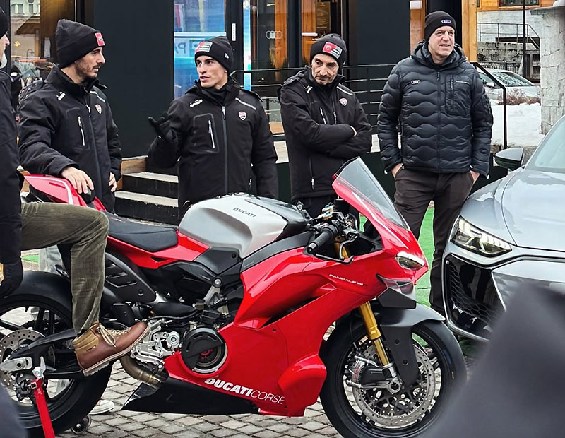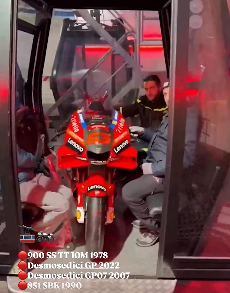 Pour rendre hommage au centenaire de la marque et à son passé, les hommes en rouge n’ont pas hésité à investir la très courue station de ski dans les Dolomites avec de gros moyens, et à monter en altitude, d’abord via des 4X4 puis avec une télécabine, une 900 SS TT IOM de 1978 de Mike Hailwood, une 851 SBK de 1990 de Raymond Roche, une Desmosedici GP07 de 2007 de Casey Stoner, et la Desmosedici GP22 de Francesco Bagnaia !