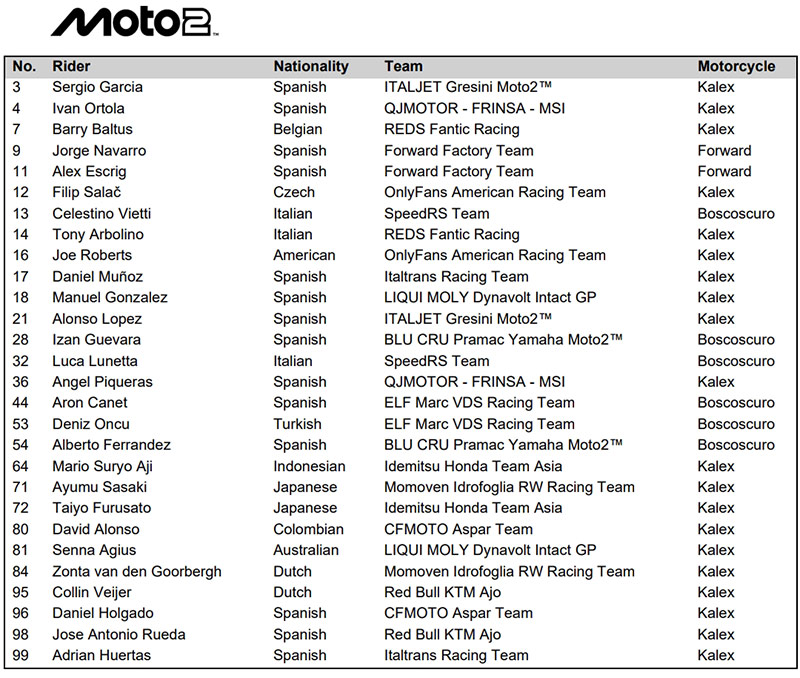 Ils seront répartis en 22 pour la catégorie reine, 28 pour la catégorie intermédiaire et 27 pour celle d’entrée, cela ne comprenant pas les participants à la Red Bull MotoGP Rookies Cup ni ceux à la Harley-Davidson Bagger World Cup.