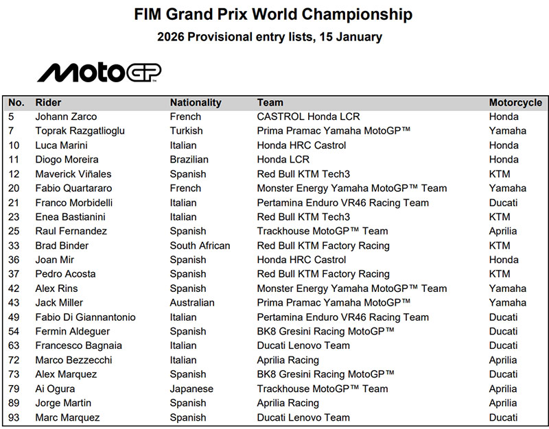 Les Listes d’Engagement provisoires des pilotes pour le Championnat du Monde FIM MotoGP 2026 sont maintenant publiées.