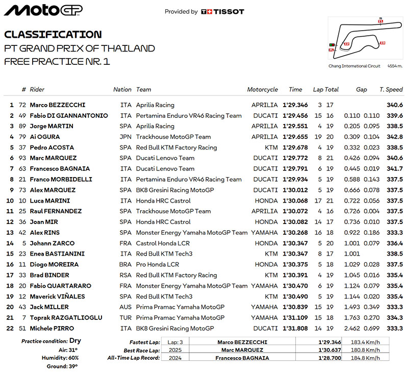 En attendant d’en découvrir davantage, au moment où les 22 pilotes se préparent pour cette première Practice 2026 de 60 minutes, sous un ciel dégagé avec des températures de 31° dans l’air et 38° au sol, profitons de ces quelques moments de direct grâce au site officiel MotoGP.com :