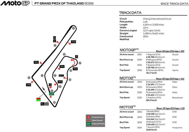 Pour écrire ce premier chapitre de cette saison MotoGP 2026, il faudra parcourir 13 fois le tracé de 4554 mètres lors du Sprint de samedi (soit 59,15 km) et effectuer 26 boucles (118,4 km) le dimanche, sur une piste au tracé très complet, alternant longues lignes droites, gros freinages et courbes rapides, contraignant Brembo à imposer ses plus gros disques en carbone, et Michelin, dont l’allocation de l’avant d’offre plus que deux choix, à anticiper que « la gestion du « spinning » est absolument cruciale. »