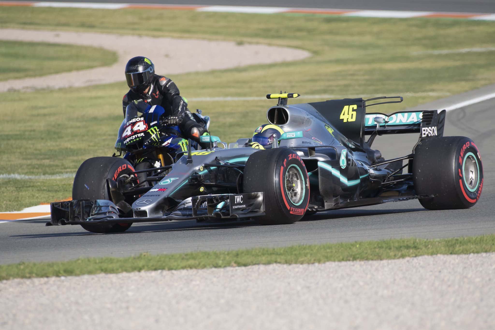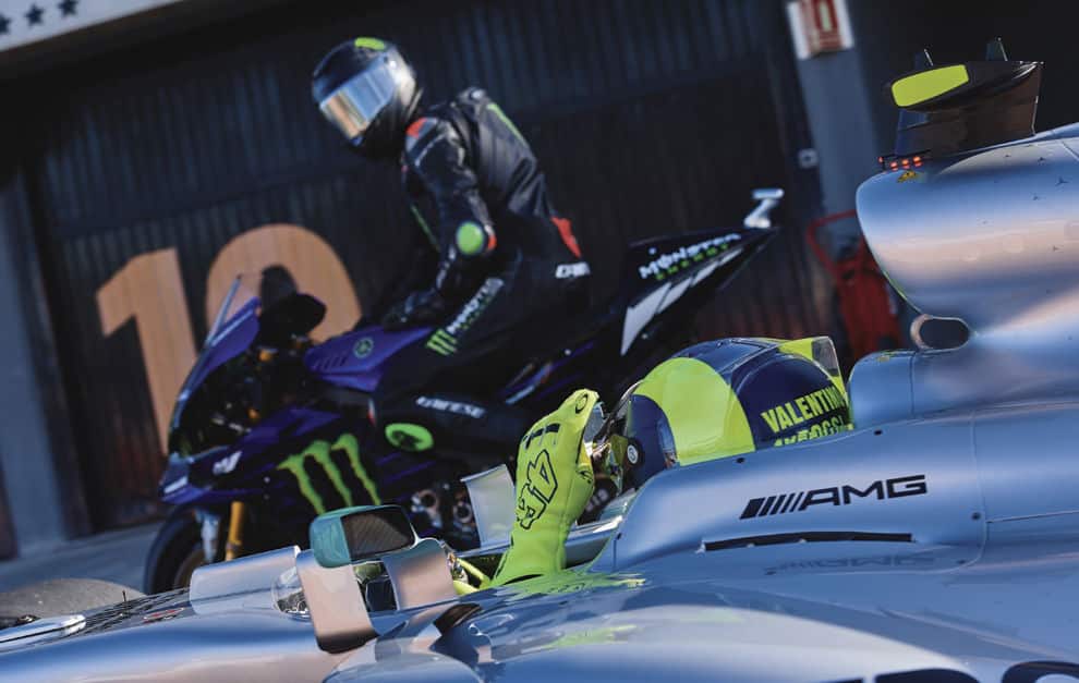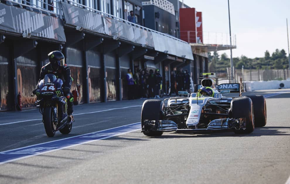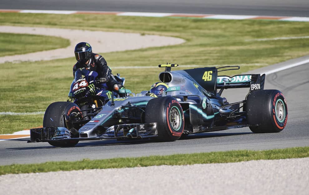 Sur l’événement qui a rassemblé Valentino Rossi et Lewis Hamilton sur le tracé de Valence et portant sur un échange de leurs bolides, on ne sait que des principes généraux du genre que le Doctor a piloté la Mercedes de F1 et que le Britannique a pris le guidon de la M1. Ce dernier a chuté, il a roulé seul et il a aussi fait des tours derrière Valentino Rossi.