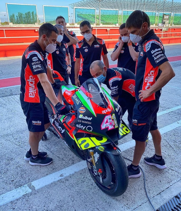 C’est à des essais intensifs que s’est livré le team officiel Aprilia sur le circuit de Misano, avec un progrès régulier et constant pour son leader Aleix Espargaró. Auteur de 1’33.97 le mardi, l’Espagnol progressait en 1’33.427 le deuxième jour, devancé par Miguel Oliveira (KTM Tech 3) en 1’32.913. Aleix terminait finalement deuxième grâce à son 1’32.932 réalisé le troisième et dernier jour.