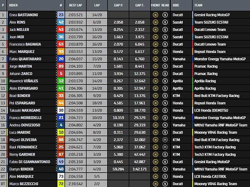 Contre mauvaise fortune, Alex Marquez fait toujours bon cœur : « je suis positif, j’ai pu faire cinq tours et demi en étant agressif et en me battant pour dépasser des pilotes. Ce n’est pas le pire week-end, en FP1 j’ai été dans de bonnes positions, au warm up j’ai été bon et en course j’ai été agressif. Ce sont des choses positives » dit-il avant de se projeter sur la suite, en Europe : « le Portugal, surtout pour moi, est un rendez-vous particulier où je suis bon et l’année dernière j’ai obtenu de bons résultats, c’est un bon test pour nous pour voir comment nous nous en sortons ».