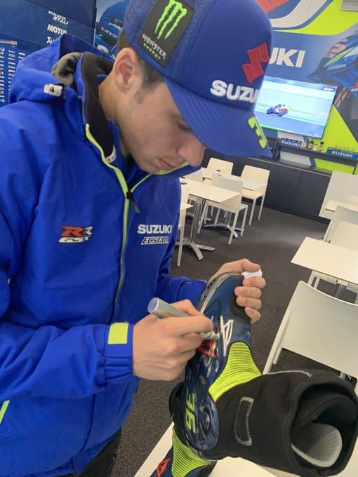 Pour cette nouvelle vente aux enchères de solidarité, Alex Rins a fait don d’un casque très spécial avec la devise « Fight Strong » et de bottes spécialement personnalisées simulant le port des lacets d’or vendus par « Unoentrecienmil » sur « www.loscordonesdorados.org » pour collecter des fonds. Joan Mir a quant lui dédicacé les bottes avec lesquelles il a couru lors de l’événement de Valence et les a livrées pour cette vente aux enchères caritative qui intégrera prochainement un casque signé par les deux pilotes Suzuki Ecstar. D’autres produits restent encore à venir.