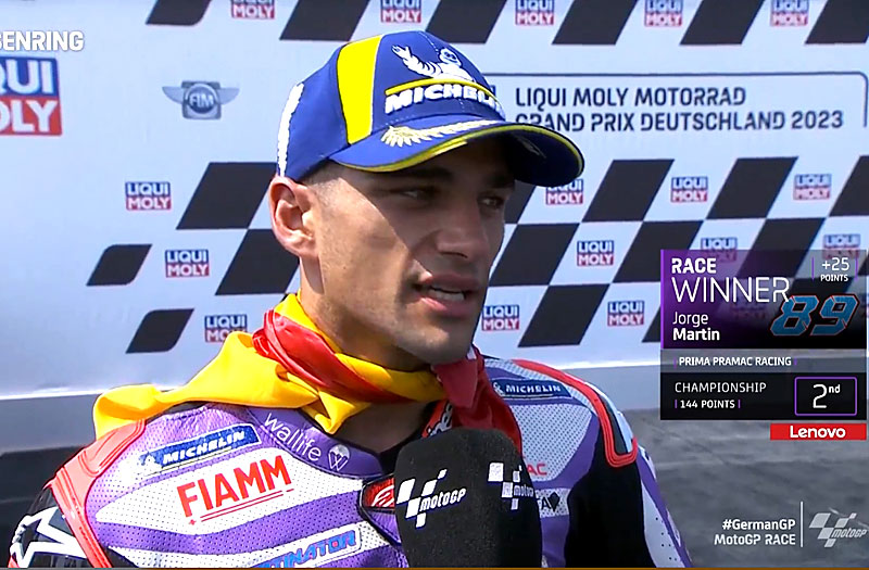 A peine descendu de sa Ducati GP23 du team Prima Pramac Racing après avoir remporté le Grand Prix d’Allemagne au Sachsenring, Jorge Martín s’est confié devant les caméras du site officiel MotoGP.com avec l’immense joie d’obtenir sa deuxième victoire en MotoGP…