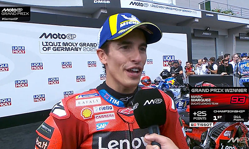 A peine descendu de sa Ducati GP25 du team d’usine Ducati Lenovo après avoir remporté la course du Grand Prix d’Allemagne MotoGP 2025 au Sachsenring, Marc Marquez s’est confié devant les caméras du site officiel MotoGP.com avec la joie de terminer la mi-saison de façon parfaite…