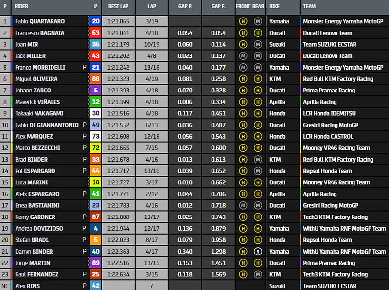 A la mi-séance, le tableau affiche Fabio Quartararo, Francesco bagnaia, Jack Miller, Miguel Oliveira, Johann Zarco, Maverick Vinales, Takaaki Nakagami, Fabio Di Giannantonio, Marco Bezzecchi, Brad Binder, Alex Márquez, Joan Mir, Luca Marini, Aleix Espargaro, Enea Bastianini, Stefan Bradl, Pol Espargaro, Andrea Dovizioso, Darryn Binder, Raul Fernandez, Jorge Martin, Remy Gardner et Franco Morbidelli.