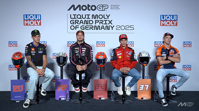 Cette conférence de presse en prélude au Grand Prix d’Allemagne MotoGP 2025 sur le Sachsenring a réuni Marc Marquez, Marco Bezzecchi, Pedro Acosta et Fabio Quartararo.