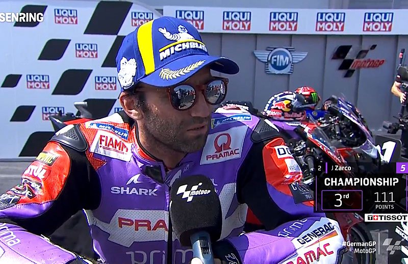 A peine descendu de sa Ducati GP22 du team satellite Prima Pramac Racing après avoir obtenu la 2e place du Grand Prix d’Allemagne sur le circuit du Sachsenring, Johann Zarco s’est confié, très fatigué, devant les caméras du site officiel MotoGP.com et de Canal+ avec la satisfaction de faire un travail très solide en ce moment.