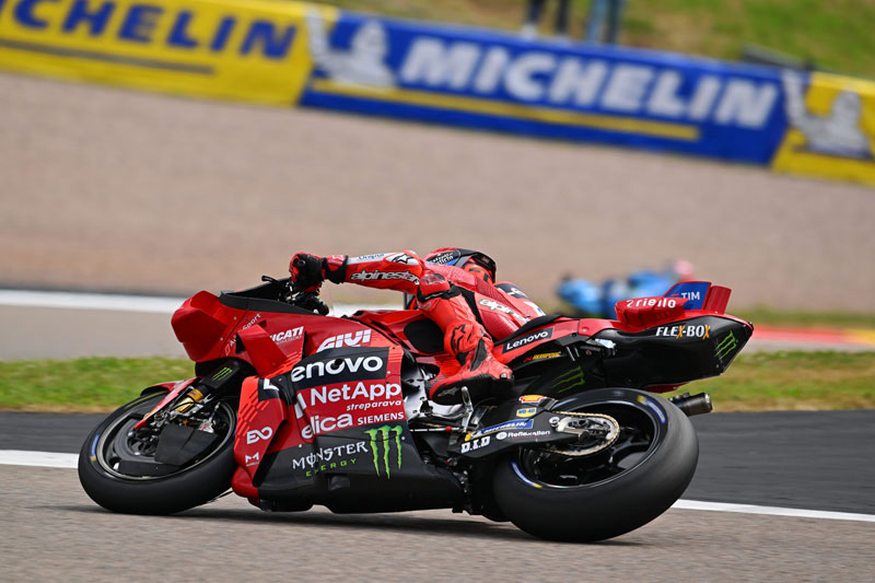 Pour le Liqui Moly Grand Prix of Germany, Michelin avait mis à disposition de ses partenaires trois choix de gomme asymétriques (Soft, Medium, Hard) pour la roue avant, et deux mélanges asymétriques (Soft et Medium) pour la roue arrière. Il est important de souligner que des pneus asymétriques à la fois à l’avant et à l’arrière représentent une configuration rare dans la saison, uniquement utilisée à trois reprises (Phillip Island, Sachsenring et Valence, en Espagne) sur un total de 22 Grand Prix.