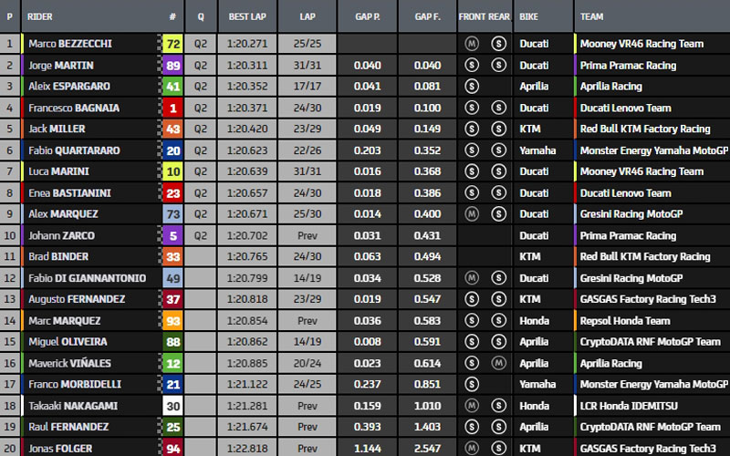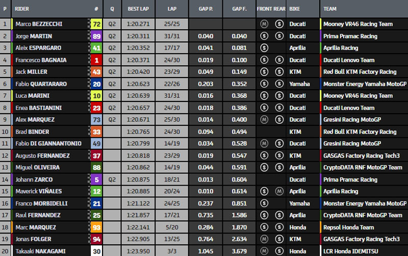 Au final, Marco Bezzecchi, Jorge Martin, Aleix Espargaro, Francesco Bagnaia, Jack Miller, Fabio Quartararo, Luca Marini, Enea Bastianini, Alex Márquez et l’infortuné Johann Zarco accèdent directement à la Qualification-2 qui s’annonce très chaude…