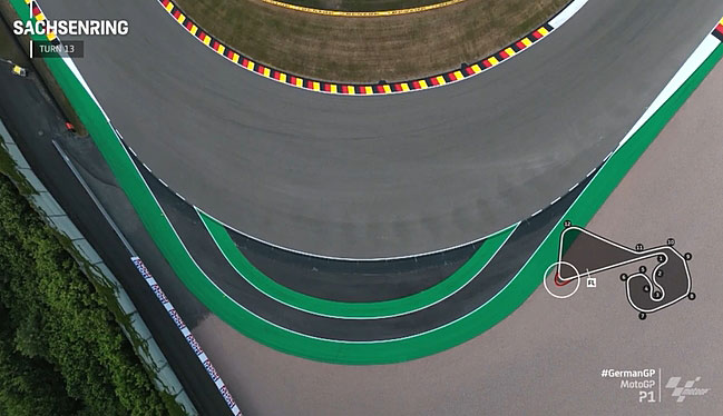 … mais finalement, au moins pour aujourd’hui, elles ne se sont guère trompées et c’est une piste encore très humide à 21° que les 20 pilotes MotoGP vont parcourir sous un ciel qui lâche encore quelques gouttes sur l’asphalte du Sachsenring dont le Long Lap se fait dorénavant au virage #13.