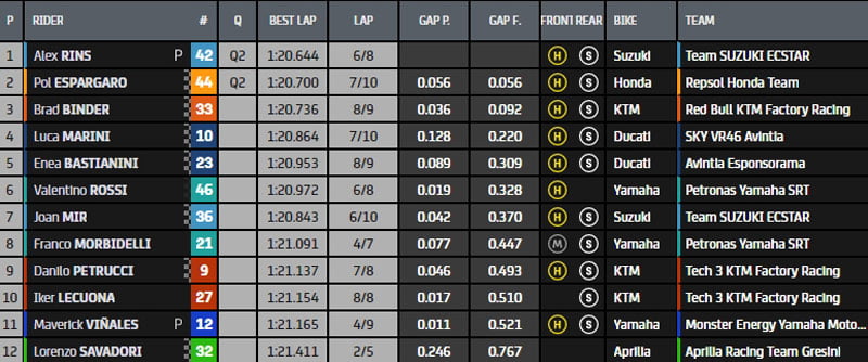 En lançant une tentative de chrono, Joan Mir se rate, Brad Binder fait une erreur. Il reste moins de deux minutes. Rins est en 1’20.644 devant Pol Espargaró. Brad Binder est le premier éliminé. il leur reste tous encore un tour… Morbidelli chute. Drapeau jaune ! On aura donc Rins et Pol Espargaró en Q2, Brad Binder en reste là pour 36 millièmes. Viñales partira avant dernier. Mir 17e derrière Rossi. Lecuona a chuté.