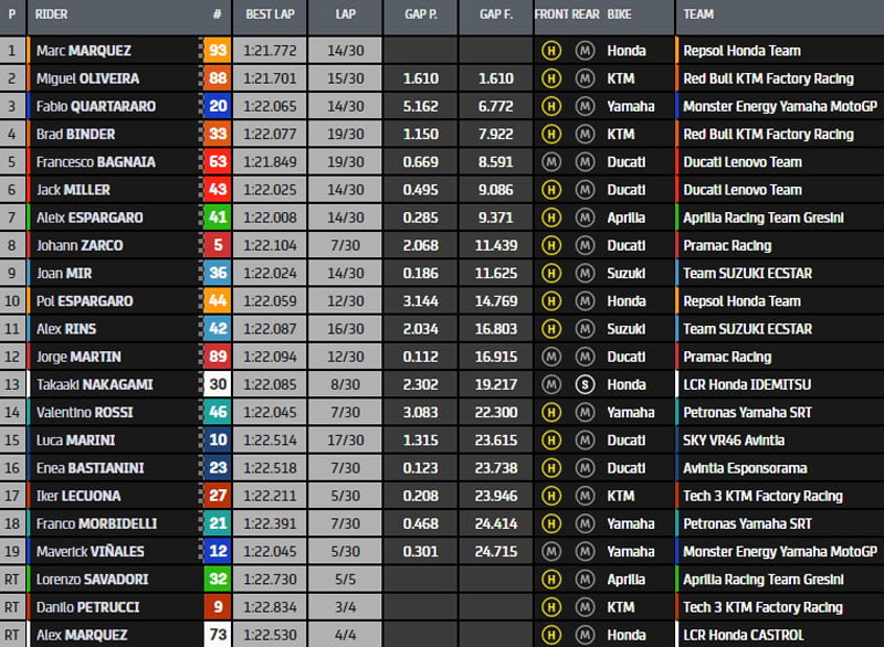 Il reste 4 tours et le top10 est le suivant: MMarquez, Oliveira, Quartararo, Binder, Miller, Espargaro, Bagnaia, Zarco, Mir et Martin.