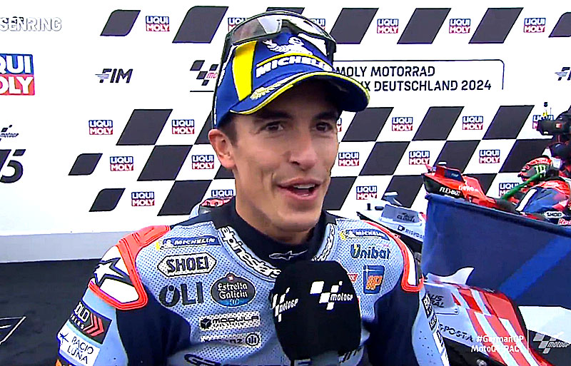 A peine descendu de sa Ducati GP23 du team Gresini après avoir terminé 2e du Grand Prix d’Allemagne MotoGP 2024 au Sachsenring, Marc Marquez s’est confié devant les caméras du site officiel MotoGP.com avec la joie de finir le week-end à l’opposé de son commencement…