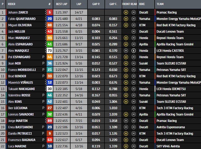 En moins de 10 minutes, les positions se stabilisent avec Fabio Quartararo, Miguel Oliveira et Jack Miller dans le même dixième de seconde, puis suivent Alex Márquez, Marc Márquez, Joan Mir Pol Espargaro, Takaaki Nakagami, Brad Binder et Franco Morbidelli.