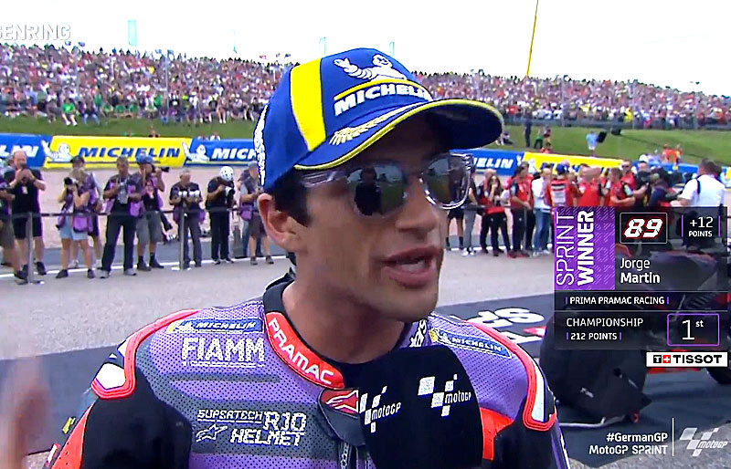 A peine descendu de sa Ducati GP24 du team Pramac après avoir remporté le Sprint du Grand Prix d’Allemagne MotoGP 2024 au Sachsenring, Jorge Martin s’est confié devant les caméras du site officiel MotoGP.com avec la joie d’être revenu au tout premier plan et d’augmenter son avance au championnat, en attendant demain…