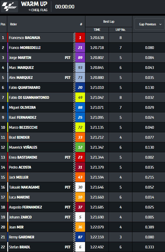 That's it then! 🏁@PeccoBagnaia tops Warm Up, 0.080s clear of @FrankyMorbido12 👊#GermanGP 🇩🇪 pic.twitter.com/Hs61uTpOxx