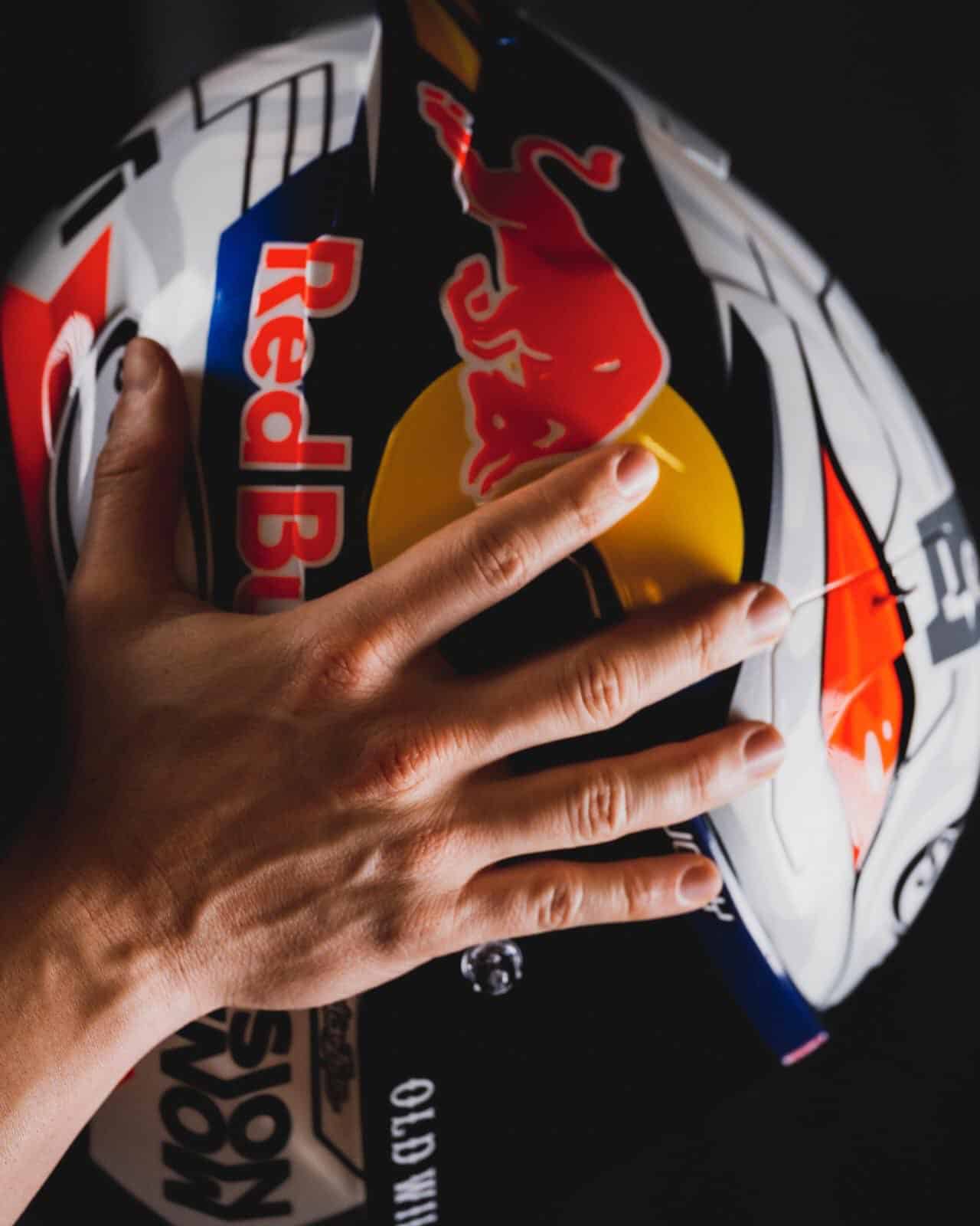 De fait, deux grands yeux rouges se détachent à côté du logo Red Bull sur le casque Suomy. « J’ai vraiment aimé le casque précédent, mais je voulais changer quelque chose. Les modifications sont apportées lorsqu’elles ont un sens. J’y ai travaillé avec mon ex-physiothérapeute et artiste Francesco Chionne, connu sous le nom de « Grizzly ». Il a beaucoup d’idées et me connaît particulièrement bien » a poursuivi Andrea Dovizioso sur Corsedimoto. « Si vous voulez changer quelque chose, il a les bonnes idées. À mon avis, ces yeux seront très bien vus à la télévision. »