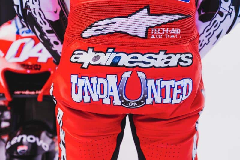 Cette saison, Andrea Dovizioso aura aussi ses échéances. Il a terminé ses trois dernières saisons avec le statut de vice-champion, ce qui n’est pas si mal. Mais il a, à chaque fois, perdu face au même adversaire qui n’est autre que le redoutable Marc Marquez. Du coup, chez Ducati, si on ne critique pas, on s’interroge et on clame à qui veut l’entendre que l’on veut être second de personne. Une pression sur les épaules à laquelle DesmoDovi répond avec ce mot inscrit un peu plus bas sur son cuir : « undaunted »… Mais c’est quoi donc ?