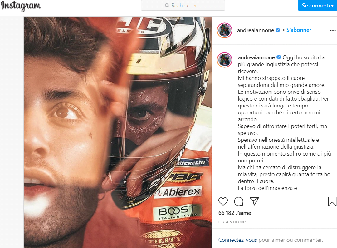 « J’ai subi la pire injustice que j’aurais pu imaginer. Mon cœur s’est déchiré en me séparant de mon plus grand amour », commence Iannone, qui ne pourra participer aux compétitions de la Fédération internationale de moto qu’en décembre 2023. « Il n’y a aucun sens logique à cette allégation, accompagnée de données erronées », ajoute-t-il en référence à l’appel de l’Agence mondiale antidopage qui a fini par porter la peine de 18 mois à 4 ans. « Il y aura un moment et un lieu appropriés, car je n’abandonne certainement pas », dit-il.
