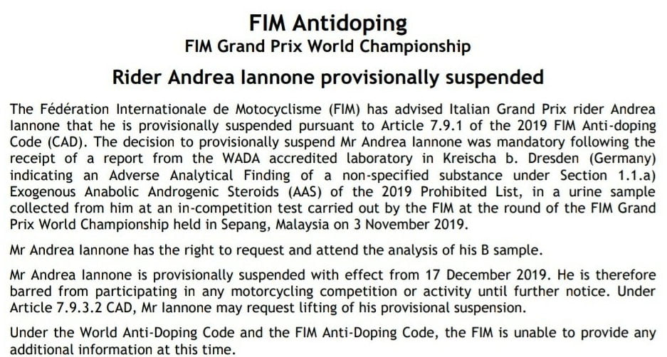 M. Andrea Iannone est provisoirement suspendu avec effet au 17 décembre 2019. Il est donc interdit de participer à toute compétition ou activité de motocyclisme jusqu’à nouvel ordre. En vertu de l’article 7.9.3.2 DAO, M. Iannone peut demander la levée de sa suspension provisoire.