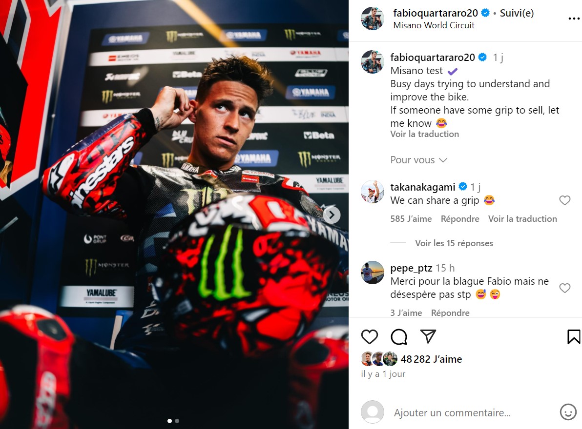 Les frustrations de Fabio Quartararo sont palpables. Dans un post Instagram, il n’a pas hésité à exprimer son désarroi sur le ton de l’humour : « des journées bien remplies à essayer de comprendre et d’améliorer la moto. Si quelqu’un a un peu de grip à vendre, faites-le-moi savoir. »