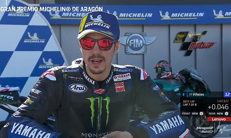 A peine descendu de sa Yamaha YZR-M1 officielle après avoir obtenu la deuxième position sur la grille de départ du Grand Prix d’Aragón, Maverick Viñales s’est confié devant la caméra du site MotoGP.com avec la satisfaction d’avoir fait le job…