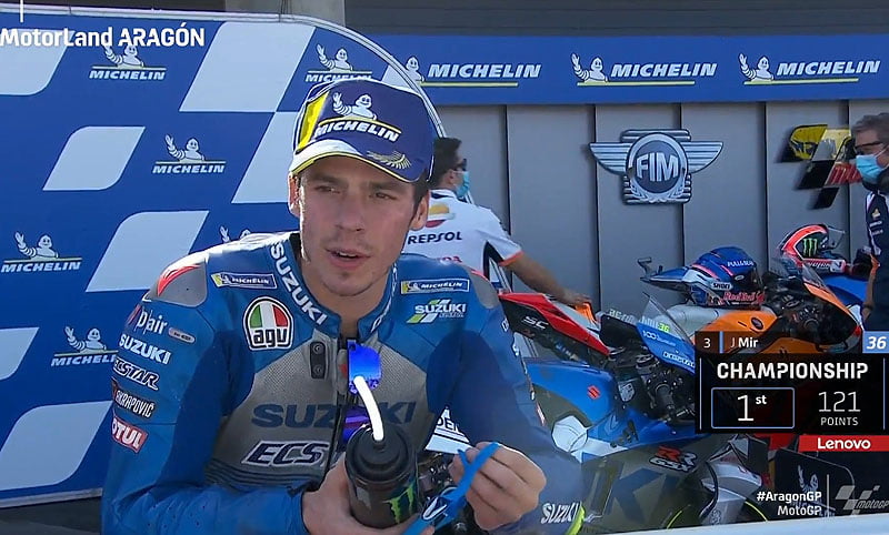 A peine descendu de sa Suzuki GSX-RR officielle après avoir remporté la troisième place lors du Grand Prix d’Aragón, Joan Mir s’est confié devant la caméra du site MotoGP.com avec la joie de s’emparer de la tête du championnat mais une petite pointe de déception…