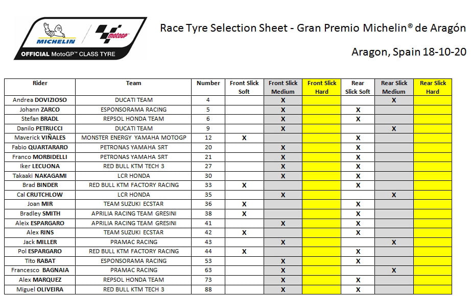 Avec les basses températures du weekend, les choix de pneus furent de toutes les discussions dans les teams et la sélection du jour comprenait quatre spécifications, seuls le hard avant et arrière n’ayant pas été retenus. Rins et Mir étaient équipés de soft/soft, alors que Márquez avait opté pour un medium avant et un soft arrière.