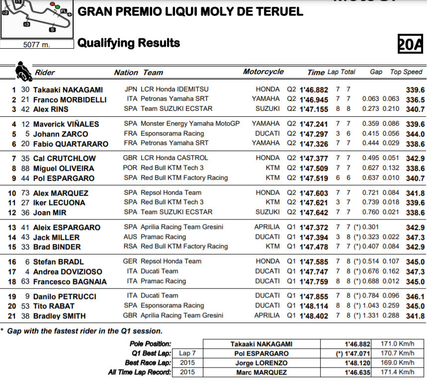Joan Mir s’élancera seulement douzième pour un Grand Prix de Teruel où il devra défendre pour la première fois de la saison sa place de leader du championnat. Une position qui n’est pas favorable au vu de la complexité de cette mission, mais le pilote de 23 ans n’est pas du genre à douter. Avec sa Suzuki, il pense pouvoir même réaliser l’exploit de jouer la victoire. Y compris face à son équipier Rins qui s’élancera troisième ?