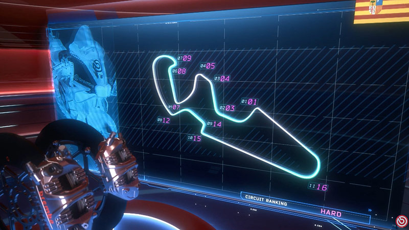 Le premier virage du MotorLand Aragon est le plus difficile pour le système de freinage : Les motos du MotoGP passent de 292 km/h à 91 km/h en 4,4 secondes, parcourant 216 mètres grâce à une charge de 6,1 kg sur le levier de frein. La décélération est de 1,5 g, la pression du liquide de frein Brembo atteint 13 bars et la température des disques de carbone atteint 690 °C.
