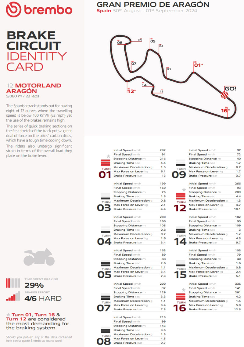 Selon les techniciens Brembo qui travaillent en étroite collaboration avec tous les pilotes de MotoGP, le MotorLand Aragon, long de 5,1 km, est considéré comme un circuit difficile pour les freins. Sur une échelle de difficulté de 1 à 6, il obtient la note de 4, en raison des 11 points de freinage par tour, dont 3 classés comme durs et 4 comme moyens. Les freins sont utilisés pendant 31 secondes par tour et, du début à la fin, chaque pilote exerce une charge totale de 925 kg sur le levier de frein.