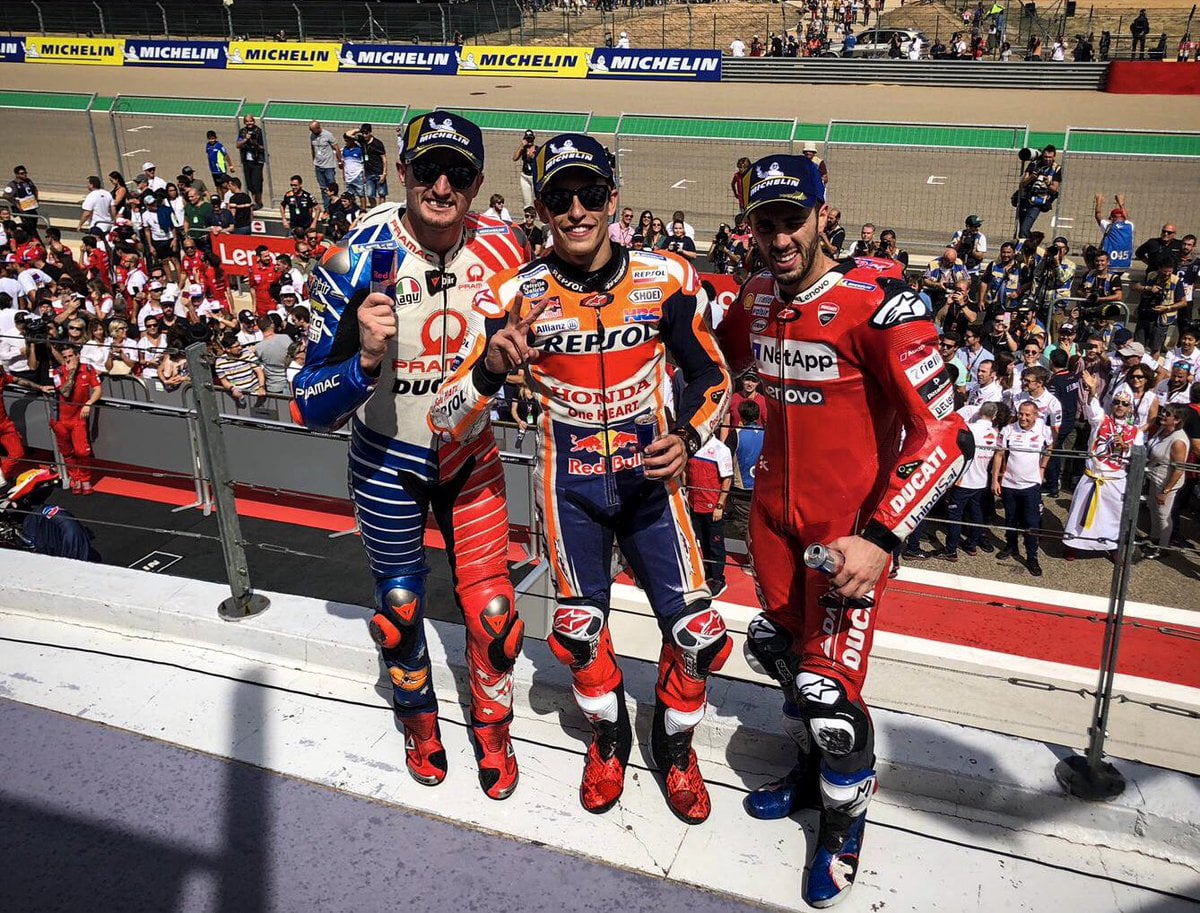 Cette huitième réalisation de l’année ouvre à Marc Márquez toute grande les portes d’une huitième couronne mondiale. 300 points, voilà sa récolte toute ronde après 14 courses. La quinzième s’annonce comme celle du sacre. Derrière, Andrea Dovizioso passe le cap des 200 unités et peut se targuer de compter autant de podiums qu’un certain Loris Capirossi, soit 99. DesmoDovi peut être soulagé. Parti dixième, il a fini son épreuve en Aragon second et conforte son statut de dauphin de Marc Márquez.