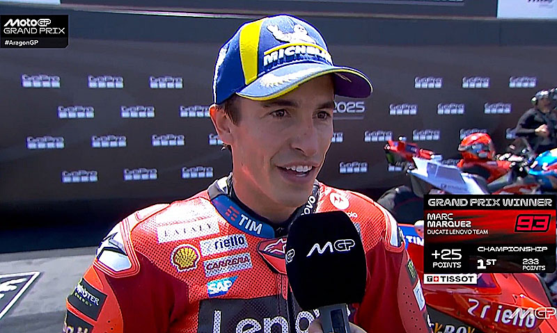 A peine descendu de sa Ducati GP25 du team d’usine Ducati Lenovo après avoir remporté le Grand Prix d’Aragon MotoGP 2025 sur le circuit Motorland Aragon, Marc Marquez s’est confié devant les caméras du site officiel MotoGP.com avec la satisfaction d’avoir coché toutes les cases ce week-end, pour la première fois depuis le Sachsenring 2015…