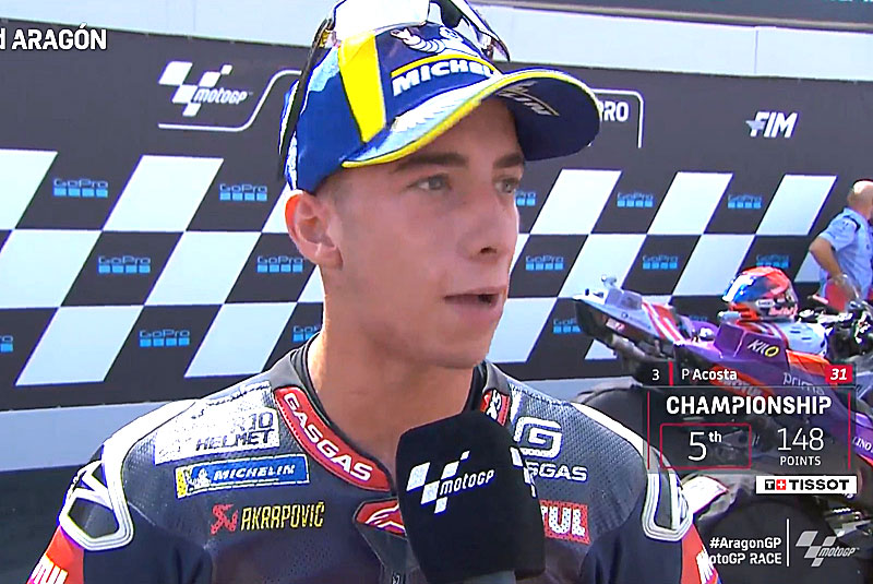 A peine descendu de sa KTM RC16 du team Red Bull GASGAS Tech3 après avoir terminé 3e du Grand Prix d’Aragon MotoGP 2024 sur le Motorland Aragon, Pedro Acosta s’est confié devant les caméras du site officiel MotoGP.com avec la joie de retrouver le sentiment d’être aussi compétitif qu’en début d’année…