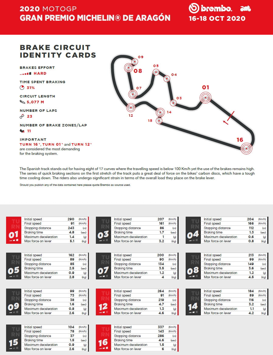 Comme pour le Superbike, les pilotes de MotoGP utilisent leurs freins dans 11 des 17 virages du MotorLand Aragón; les freins carbone de la catégorie reine sont cependant utilisés pendant 33 secondes à chaque tour, contre 31 secondes pour les freins acier du Superbike. Cela implique également une différence dans le pourcentage d’utilisation : 31% de l’ensemble de la course en MotoGP, contre 28% pour le Superbike.