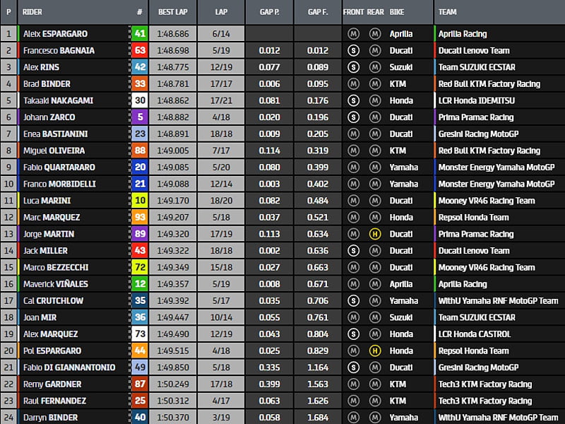 Takaaki Nakagami, poleman en 2020, progresse à la 4e position, juste derrière Alex Rins, puis Brad Binder bondit à la 4e place, mais in fine, personne n’améliore tout le chrono d’Aleix Espargaro malgré la tentative finale d’Enea Bastianini qui obtient la 7e position.