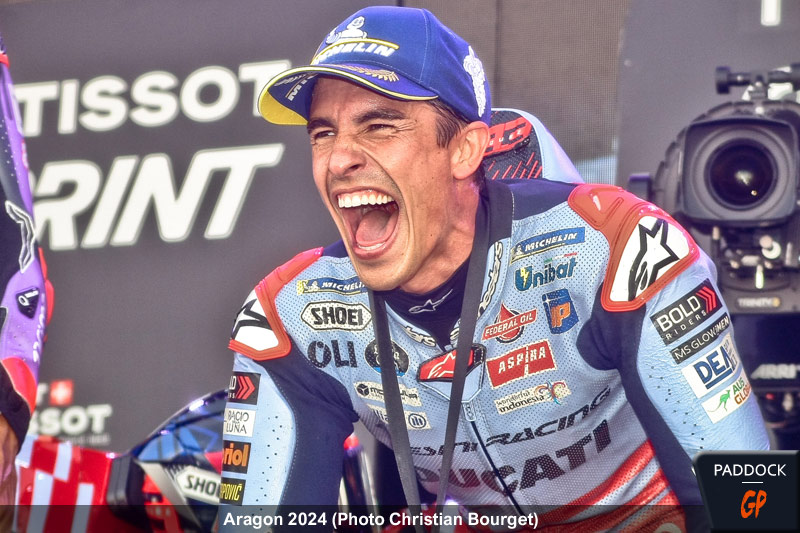 Marc Márquez a déjà remporté sa première victoire avec Ducati. Le pilote Gresini a dominé tout le week-end et n’a laissé aucune chance à ses rivaux, même dans la course sprint du GP d’Aragon. Márquez a franchi la ligne d’arrivée avec deux secondes d’avance sur Jorge Martín et six sur Pedro Acosta. Cependant, il n’est pas obsédé par l’idée de répéter ce résultat demain. Voici ses propos, rapportées par notre collègue Alba Casares depuis Alcañiz.