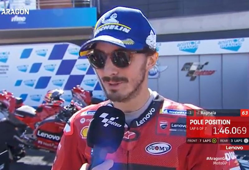 A peine descendu de sa Ducati GP22 officielle après avoir obtenu la pole position du Grand Prix d’Aragón MotoGP sur le circuit Motorland Aragón, la 11e en carrière, Francesco Bagnaia s’est confié devant les caméras du site officiel MotoGP.com avec la satisfaction d’avoir battu le record du circuit lors d’un tour d’anthologie …