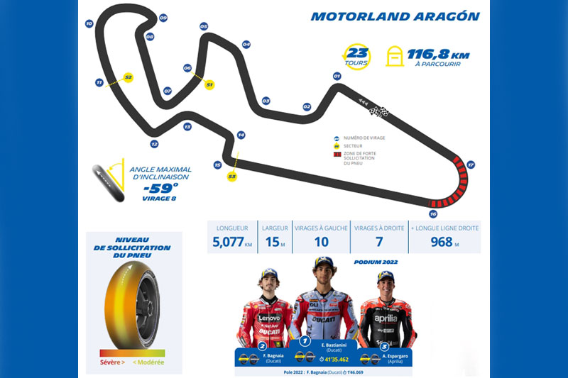 Le Championnat du Monde FIM MotoGP retrouve pour la première fois depuis 2022 le « Circuito de Alcañiz », au cœur du grand complexe Motorland Aragon. Inauguré en 2009, celui-ci a accueilli pour la première fois un Grand Prix moto en 2010. Devenu un haut lieu du MotoGP, Motorland Aragón a même été le théâtre de deux courses de MotoGP en 2020, dans un contexte sanitaire qui a perturbé le calendrier. En 2023, le tracé long de 5,077 km, emprunté dans le sens inverse des aiguilles d’une montre (10 virages à gauche, 7 à droite, deux lignes droites dont la plus longue atteint 968 m) a entamé d’importants travaux de rénovation. L’ensemble de son asphalte a été remplacé, et c’est désormais une piste 100 % nouvelle que vont découvrir les équipes de Michelin Motorsport et leurs partenaires.