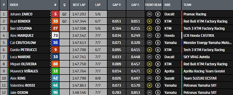 Ces 10 pilotes ont été rejoints par Johann Zarco et Brad Binder, repêchés en Qualification 1.