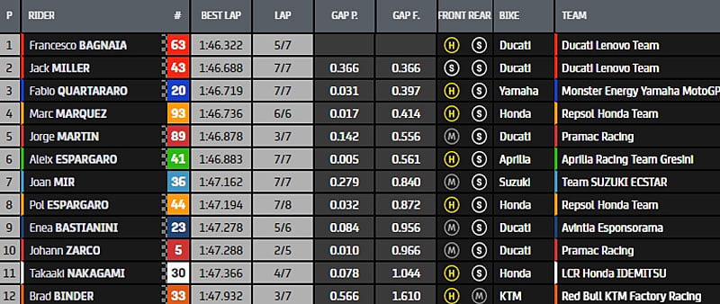 Johann Zarco rentre dans la danse à mi-séance et le classement est alors constitué de Fabio Quartararo, Jorge Martin, Francesco Bagnaia, Jack Miller, Marc Márquez, Joan Mir, Johann Zarco, Takaaki Nakagami, Aleix Espargaro, Enea Bastianini, Pol Espargaro et Brad Binder.