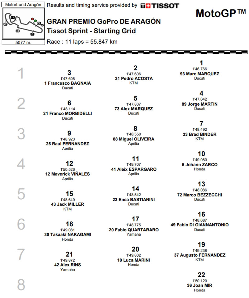 Le maître de la spécialité, Jorge Martin, qui a chuté en début de qualification, s’élancera depuis la quatrième position aux côtés d’Alex Márquez (Gresini Racing MotoGP™) et Franco Morbidelli (Prima Pramac Racing), tandis que Johann Zarco (Castrol Honda LCR), pour la première fois de l’année, fera partir une Honda depuis la quatrième ligne.