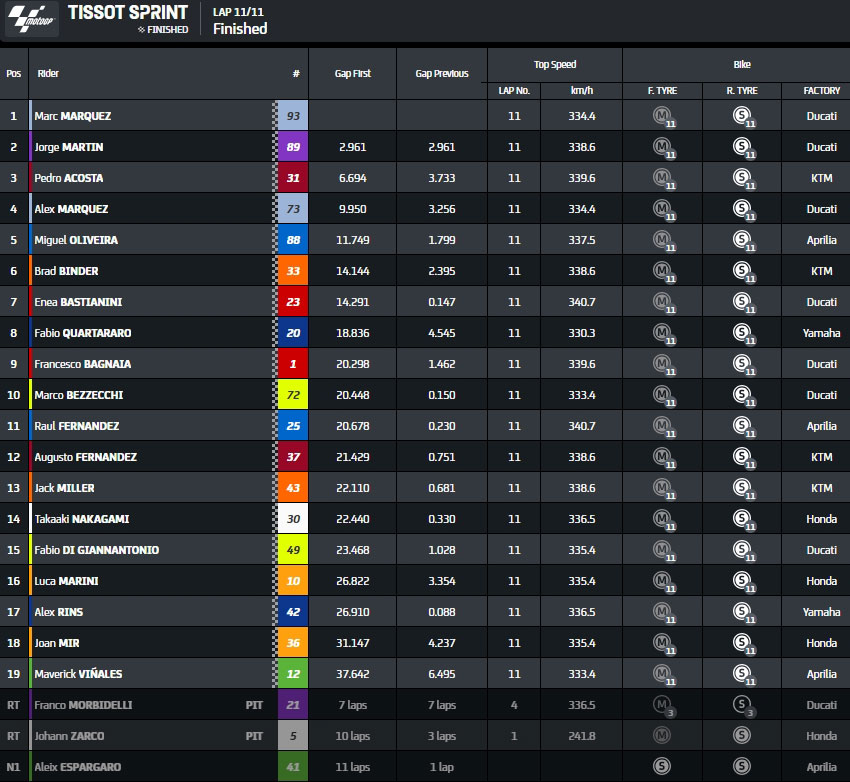 Résultats du Sprint du Grand Prix d’Aragon MotoGP 2024 au Motorland Aragón: