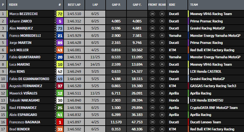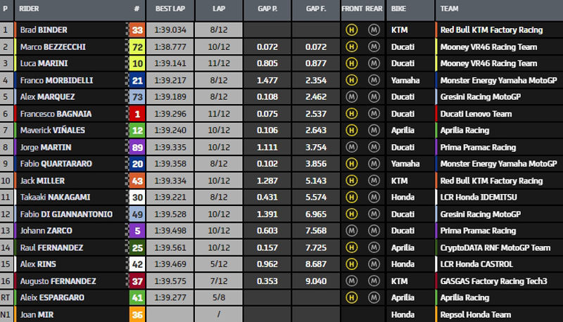 La course Sprint du samedi (12 tours) s’est déroulée sur une piste encore très humide, sale et froide (25°C maximum), au niveau de grip très faible. Les pilotes ont choisi en majorité le pneus Hard pour l’avant, et 100 % du plateau a opté pour un Medium à l’arrière. A cause des conditions, trouver la bonne fenêtre de fonctionnement des pneus a été un véritable défi, relevé avec brio par Brad Binder (Red Bull KTM Factory Racing) qui remporte la Sprint devant Marco Bezzecchi (Mooney VR46 Racing Team), et son coéquipier Luca Marini.