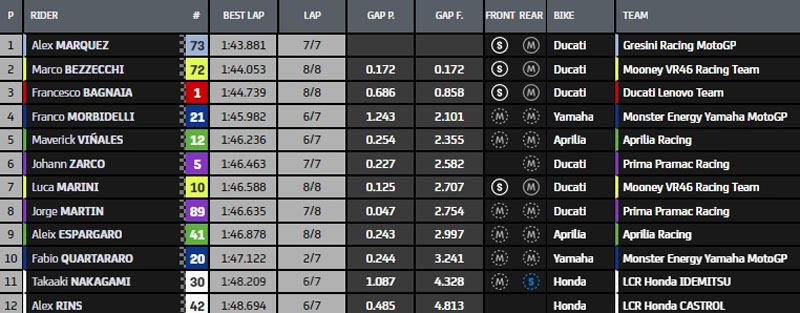 Grâce à son choix audacieux et au grip des pneus Michelin, Álex Márquez (Gresini Racing MotoGP) réalise d’ailleurs la première pole position de sa carrière en MotoGP, devant Marco Bezzecchi (Mooney VR46 Racing Team) et Francesco Bagnaia (Ducati Lenovo Team) lesquels avaient eux aussi choisi de passer en slick avant la fin de la Q2.