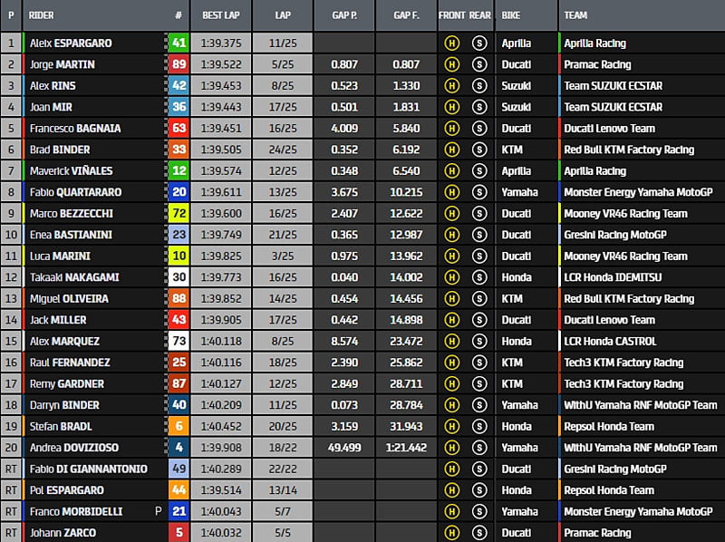 Le top10 est le suivant à 19 tours du but: Martin, Espargaro A., Rins qui passe en live Pol Espargaro, Mir, Marini, Vinales, Bagnaia, Binder, Bastianini. Quartararo est 12e