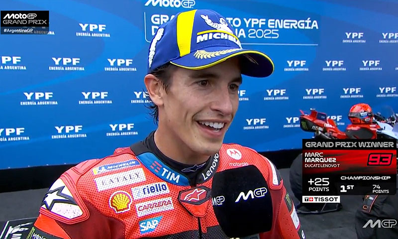 A peine descendu de sa Ducati GP25 du team d’usine Ducati Lenovo après avoir remporté le Grand Prix d’Argentine MotoGP 2025 sur le circuit de Termas de Rio Hondo, Marc Marquez s’est confié devant les caméras du site officiel MotoGP.com avec la joie de continuer son parcours parfait malgré la pression exercée par son frère…